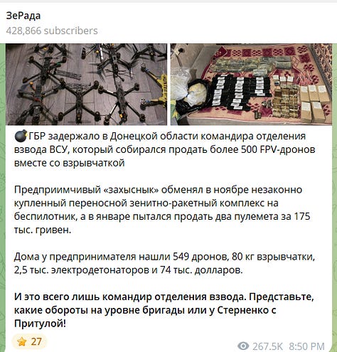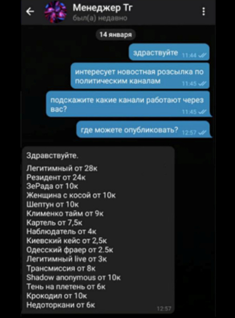 Також правоохоронці опублікували скриншот, де він приймав оплату за замовні публікації в мережі анонімних телеграм-каналів. Крім «ЗеРади», туди входили такі сторінки: «Легитимный», «Резидент», «Сплетница», «Наблюдатель», «Картель», «First Новости Войны», «Женщина с косой», «Украина live». Всі ці канали створили впродовж кількох днів у грудні 2018 року.