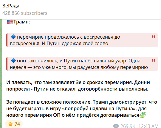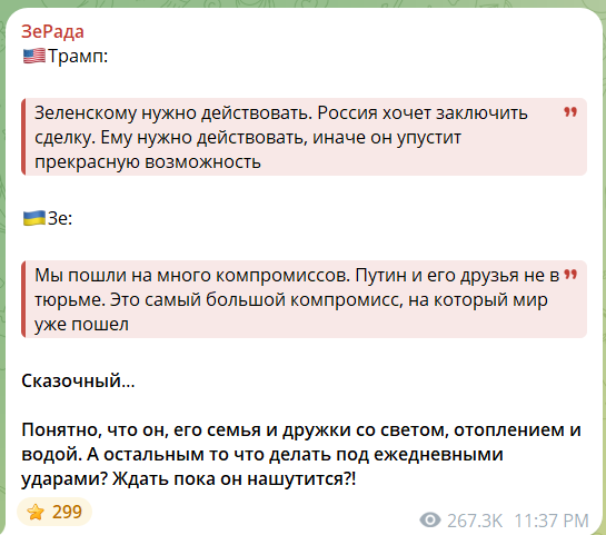 «ЗеРада» підхоплює тези кремлівської пропаганди та поширює нібито інсайди української політики. Канал пише про мирні переговори й звинувачує Україну та президента Володимира Зеленського в затягуванні війни й зриві мирних ініціатив Дональда Трампа. Крім цього, канал називає Україну тоталітарною державою.