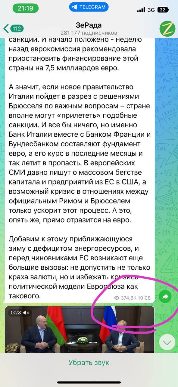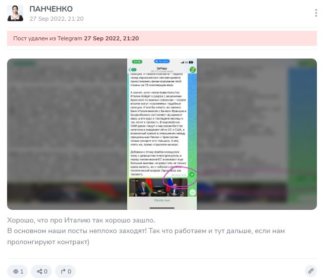 У видаленій публікації йшлось про зростання охоплень на анонімному телеграм-каналі «ЗеРада». Панченко запостила скриншот, де виділила дані про кількість переглядів допису про парламентські вибори в Італії. Пропагандистка похвалила команду: «Хорошо, что про Италию так хорошо зашло. В основном наши посты неплохо заходят! Так что работаем и тут дальше, если нам пролонгируют контракт)».